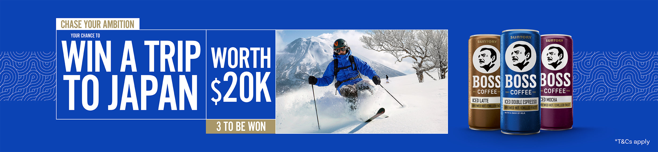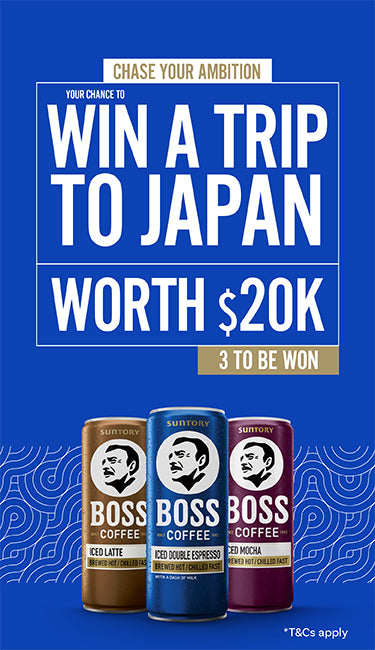 *Conditions apply, AU res. 18+. Starts 05/11/2025. Ends 07/01/2026. Two entries per person, per day. Maximum 1 prize per person (SA residents exempt). Purchase any Suntory BOSS Coffee to enter. Keep receipt/s. Prize draws will take place at 11am (AEDT) 12 January 2026 at Greeneagle Fulfilment, 5/9 Fitzpatrick Street, Revesby NSW 2212. Major Prize is 1x $20,000 (AUD) Free-2-Travel voucher to be used on a trip to Japan. 3x Major Prizes to be won across all participating retailers. Ampol Foodary Minor Prize is 63x $100 Prezzee e-Gift Cards. Reddy Express Minor Prize is 36x $50 Shell e-Gift Cards. Winners published at www.suntorybosscoffee.com/japanpromoau on 19/01/26. Promoter: Suntory Beverage & Food Australia Pty. Ltd (ABN 73 060 091 536) of Tower 1, Level 18, 201 Sussex Street, Sydney NSW 2000. ACT Permit No. TP 25/01923, NSW Authority TP/04490 and SA Permit No. T25/1440.